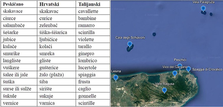 Primjerice, riječi hrvatskog podrijetla u mjesnim dijalektima: jale,jalile/jalidde/sciale (žalo), langliste (glista), pugghiaca (puž), salambache (zelembać), salippece (sljepić), vuschere/vauschere (gušterica), scazcavazzo (skakavac)…itd., zatim znakoviti naziv plaže „Spiaggia di Crovatico“ (hrvatska plaža) nedaleko grada Peschici, kojeg su, kao i susjedno mjesto Vico del Gargano (prema jednoj legendi s kraja XVII. stoljeća) oko 970. godine utemeljili upravo istočnojadranski doseljenici, pristigli iz hrvatskih krajeva, predvođeni legendarnim „Sueripolom“!