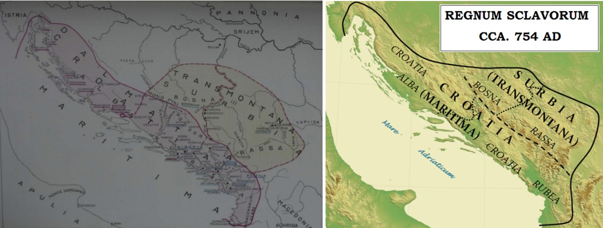 Prikaz Svetopelekovog legendarnog kraljevstva („Regnum Sclavorum“) i zemljopisni podatci iz „Ljetopisa popa Dukljanina“ prema rekonstrukciji povjesničarke Nade Klaić („Povijest Hrvata u ranom srednjem vijeku“); Dok se jadranski krajevi sa zaleđem od Vinodola do Drača nazivaju Bijelom Hrvatskom i Crvenom Hrvatskom (uključujući današnju Hercegovinu i Crnu Goru), krajevi s druge strane planina se nazivaju Srbijom („Surbia“), a obuhvaćaju Bosnu i Rašku – hrvatski povjesničar D. Mandić je smatrao kako se ova podjela zbila 754. godine!