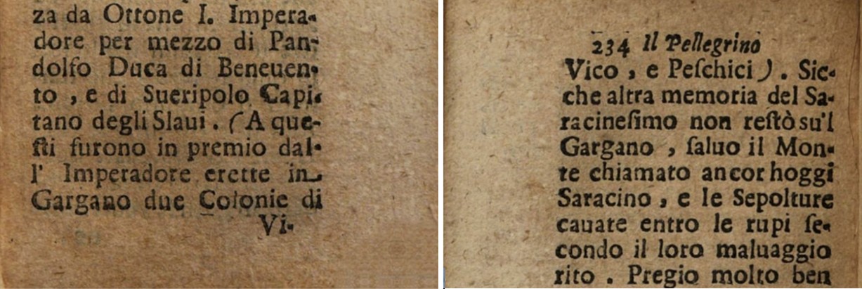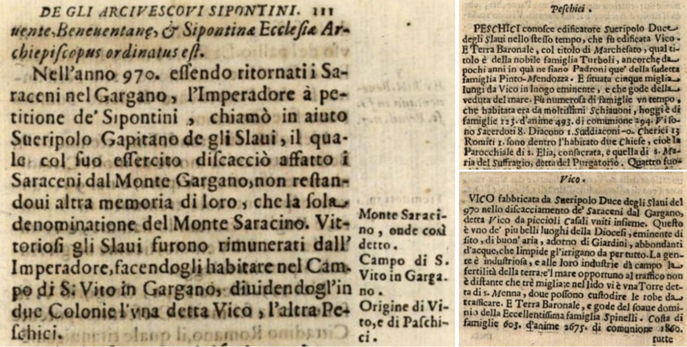 Zapis biskupa Pompea Sarnellia u djelu „Cronologia de’ vescovi et arcivescovi Sipontini colle notitie historische di molte notabili cose…“ objavljenom 1680. godine o osnutku naselja Vico del Gargano i Peschici (str. 111,435,438). Na ovaj podatak je upozorio autor Vincenzo Tedeschi u članku „La prima volta quando incontrai Sueripolo“ objavljenom u listu „Pesclizo racconta“ (veljača, 2024.)