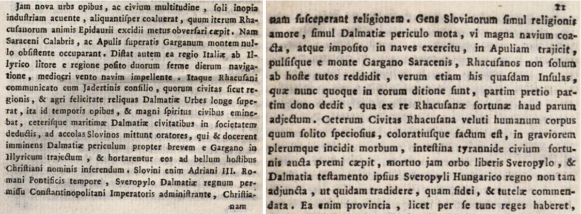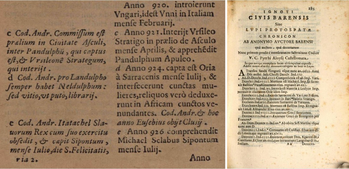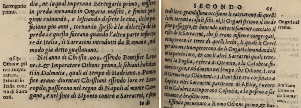 Otprilike jedno desetljeće ranije započeta je kronika talijanskog humanista Pandolfa Collenuccia (1444.-1504.) „Compendio delle historie del regno di Napoli“ u kojoj taj pisac navodi kako su oni Slaveni s istočne obale Jadrana, koji su bili kristijanizirani u vrijeme pape Hadrijana II. (867.–872.) dok je njima vladao „Sueropilo“, jedno stoljeće kasnije – godine 963. u vrijeme cara Otona I. (962-973.) i pape Lava VIII. (963.-965.) – preplovili Jadransko more te napali Saracene na Monte Garganu i Sipontskom zaljevu, pobijedili ih i protjerali, a potom se vratili svojim kućama. Potom su i Ugri (Mađari) izveli isti pothvat pobijedivši ostatak Saracena.