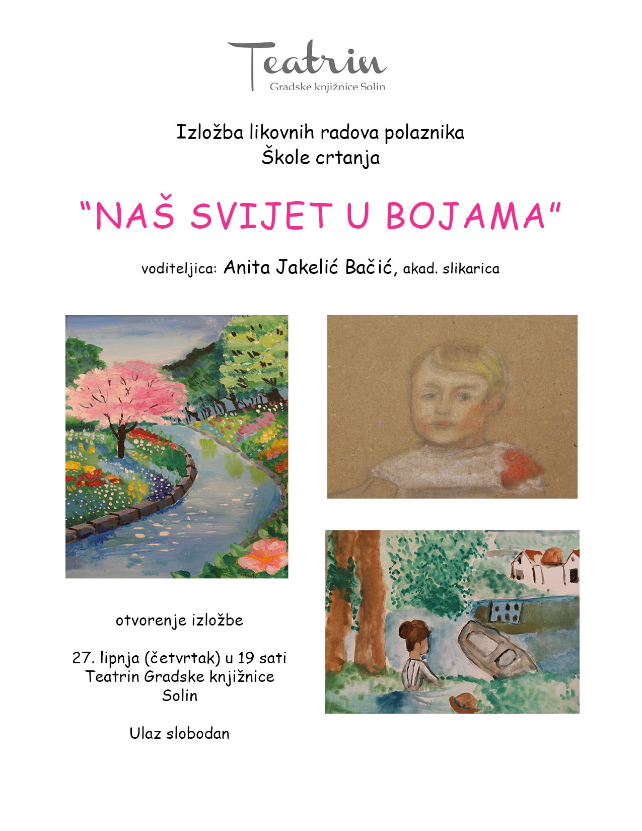 Polaznici Škole crtanja koju u Gradskoj knjižnici Solin vodi akademska slikarica Anita Jakelić Bačić u četvrtak, 27. lipnja priređuju u Teatrinu GK Solin svoju završnu izložbu likovnih radova. Otvaranje izložbe predviđeno je za 19 sati, a moći će se razgledati tijekom ljetnih mjeseci u radno vrijeme Knjižnice.