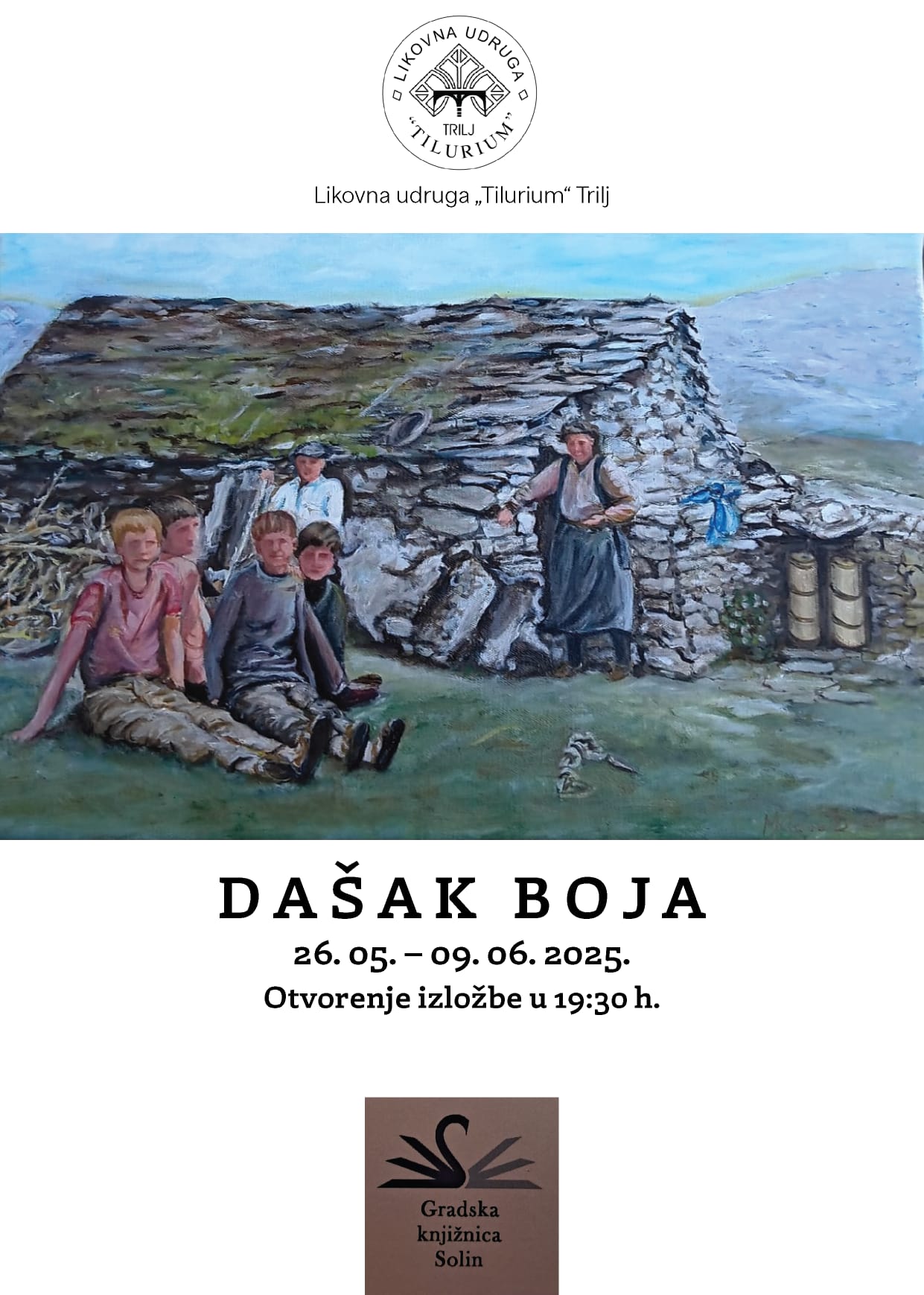 Gradska knjižnica Solin i Likovna udruga ”Tilurium” iz Trilja pozivaju na izložbu slika članova Udruge pod imenom ”Dašak boja” čije je otvorenje zakazano za ponedjeljak, 26. svibnja u 19:30 sati u Teatrinu GK Solin.