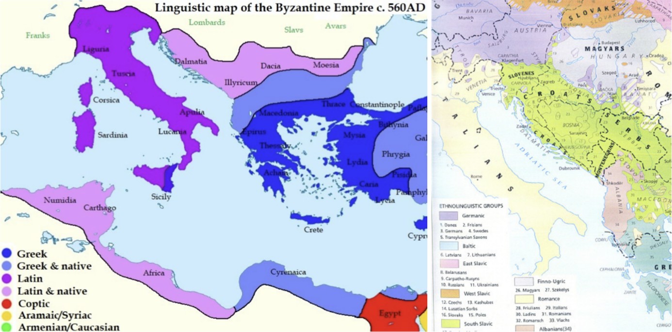 Prikaz etno-jezičnih podjela sredinom VI. i početkom XX. stoljeća: dok je na obje strane Jadrana na samom početku srednjeg vijeka dominirao latinski (ili latinski s domaćim jezicima) – iduća stoljeća su na istočnoj obali Jadrana donijela formiranje slavenskih i albanskog jezika (uz povlačenje nekadašnjih romanskih i grčkog jezika)