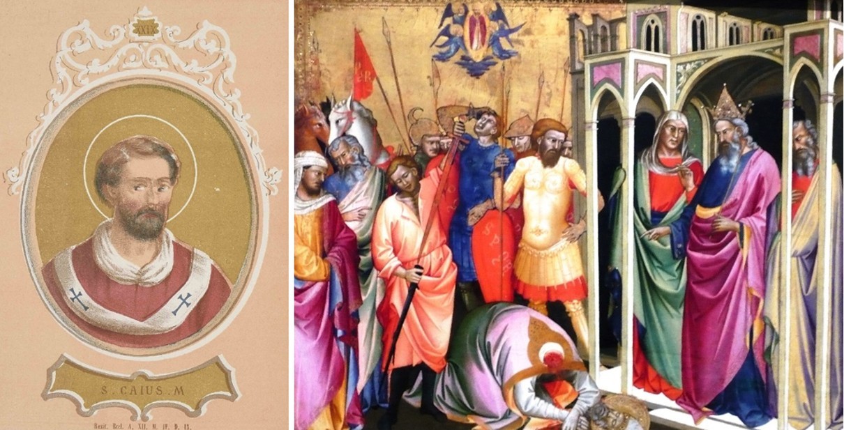 Kronološkim redoslijedom, prvi papa o kojem će ovdje biti riječi je dvadeset sedmi Petrov nasljednik papa Gaj, za kojeg se smatra kako je rođen sredinom III. stoljeća upravo u Saloni – današnjem Solinu! On je ujedno bio i ukupno drugi zabilježeni papa iz jadranskih krajeva (prvi je bio Pio I. (oko 140.-oko 154.) rođen u Akvileji), a jedna srednjovjekovna kronika „Liber pontificalis“ kaže kako mu je car Dioklecijan (284.-305.) bio ujak. Papa Gaj (ili pohrvaćeno Kajo) postao je papa samo godinu prije nego je Dioklecijan postao carem – tj. 283. godine, a smatra se kako je umro mučeničkom smrću 22. travnja 296. godine. U vrijeme svoga papinstva donio je uredbu prema kojoj se može postati biskupom samo ako se prethodno izvrše crkvene službe: ostijarija (vratara), lektora (čitača u crkvi), akolita (svjećonoše), egzorcista (istjeritelja zloduha), podđakona, đakona i svećenika. Gaj/Kajo je bio pokopan na Kalistovu groblju u Rimu, a u njegovoj rodnoj Dalmaciji uspomena na njega bila se neko vrijeme sačuvala i u nazivu današnje franjevačke provincije Presvetog Otkupitelja.
