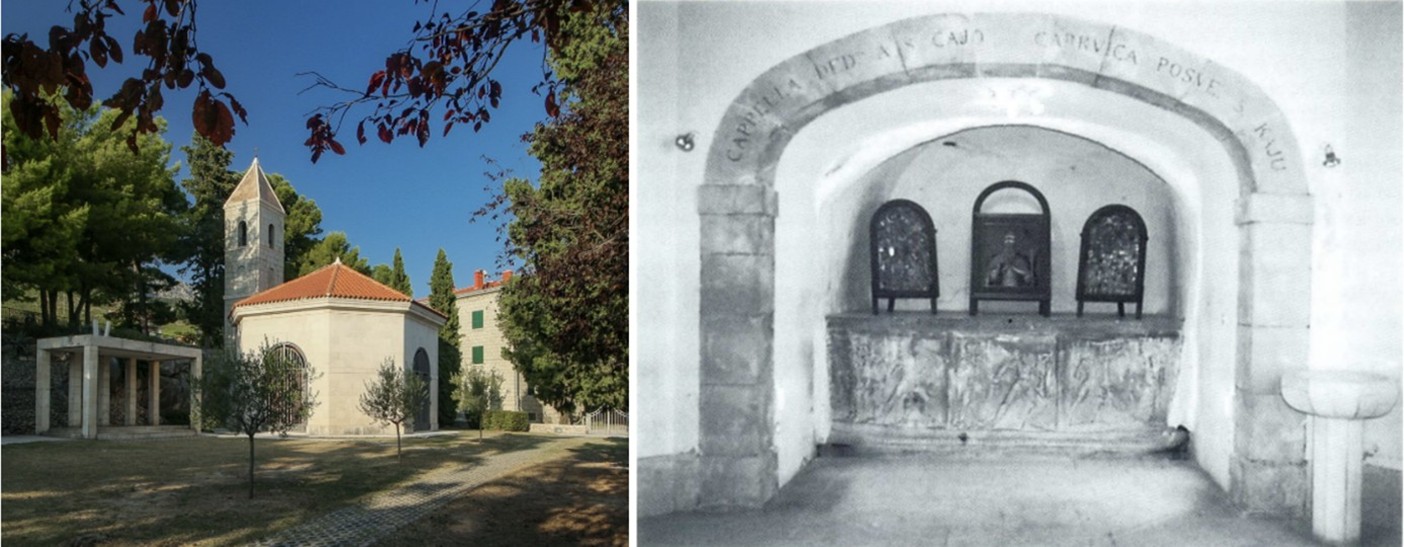 Današnji izgled osmerokutne crkve Sv. Kaja u istoimenom predjelu Solina; Unutrašnjost crkve s Heraklovim reljefima slučajno pronađenima na tom mjestu prilikom posjete austrijskog cara Franje I. Ovo otkriće označilo je početak arheoloških istraživanja Salone, kao i osnivanje današnjeg Arheološkog muzeja u Splitu