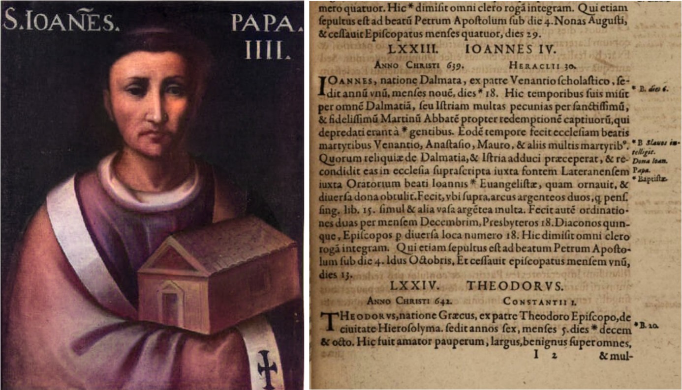 Prikaz pape Ivana IV. (640.-642.) nastao sredinom XVII. stoljeća i zapis o njegovom papinstvu u djelu „Liber pontificalis“ – kronici rimskih biskupa od I. do XV. stoljeća (izdanje iz 1605. godine), nastanak koje se ispočetka pripisivao svetom Jeronimu iako je samo djelo kompilacija više autora iz kasnijih stoljeća