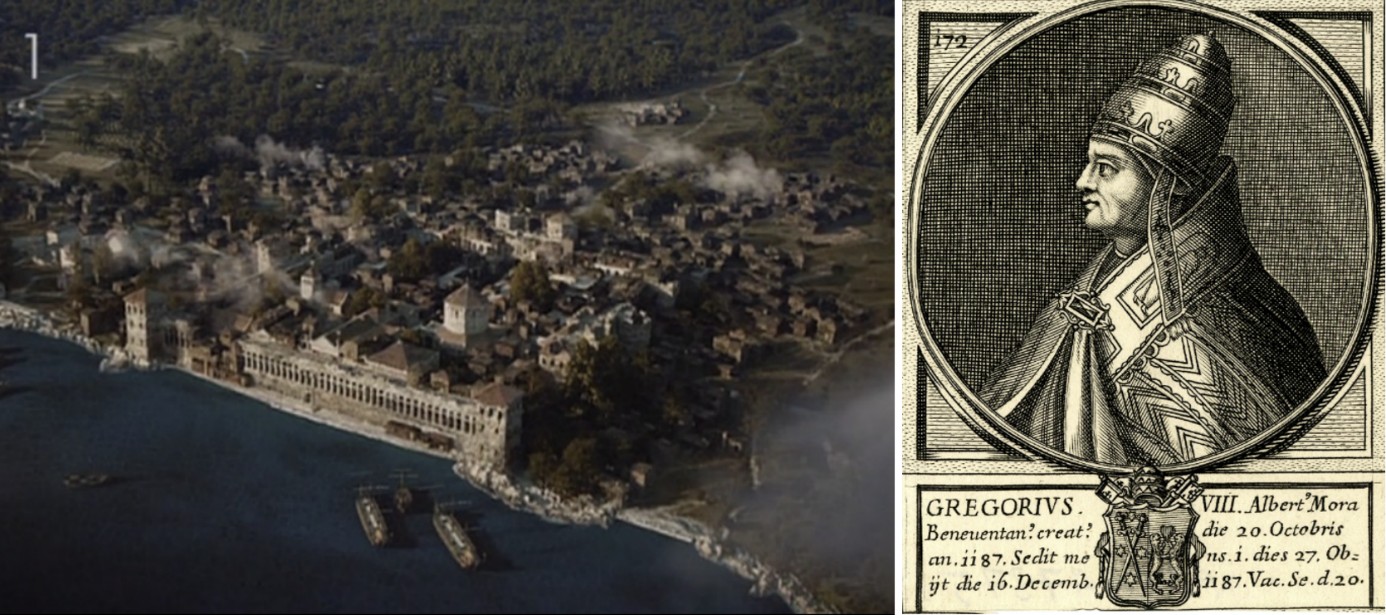 Rekonstrukcija ranosrednjovjekovnog Splita, koji se tek počeo širiti izvan zidina Dioklecijanove palače („Hrvatski kraljevi“); Ilustracija pape Grgura VIII. s papinskim grbom (u djelo nastalom u XVII. stoljeću), koji je svoje ime odabrao po uzoru na svoga velikog prethodnika Grgura VII