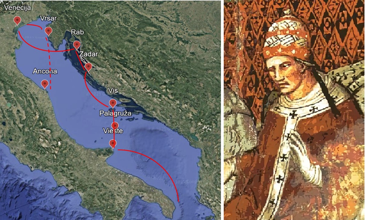 Pomorsko putovanje kojim je papa Aleksandar III. 1177. godine povezao dvije obale Jadranskog mora; Prikaz pape na fresci s početka XV. stoljeća – na putu u Veneciju papa Aleksandar je posjetio Palagružu i Vis, krenuvši na put s poluotoka Gargana (Vieste). Potom je boravio i u Zadru, gdje je bio svečano dočekan pjevanjem pjesama na hrvatskom jeziku, a u Rabu je posvetio katedralu