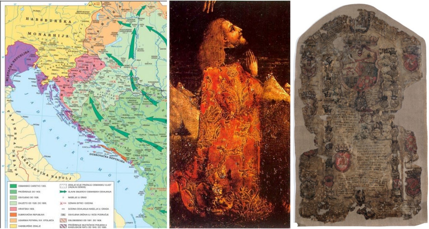 Prikaz osmanlijskih prodora na istočnoj obali Jadrana tijekom XV. i u prvoj polovici XVI. stoljeća – Osmanlije su do kraja Srednjega vijeka osvojile najveći dio Bosanskog Kraljevstva uključujući i Humsko kneštvo (današnju Hercegovinu); Portret bosanskog kralja Stjepana Tomaševića nastao oko 1460. godine (djelo Lovre Dobričevića) – na poleđini je naknadno (krajem XVI. stoljeća) pridodano tzv. „Sutješko rodoslovlje“ s prikazom grbova tzv. „ilirskih zemalja“