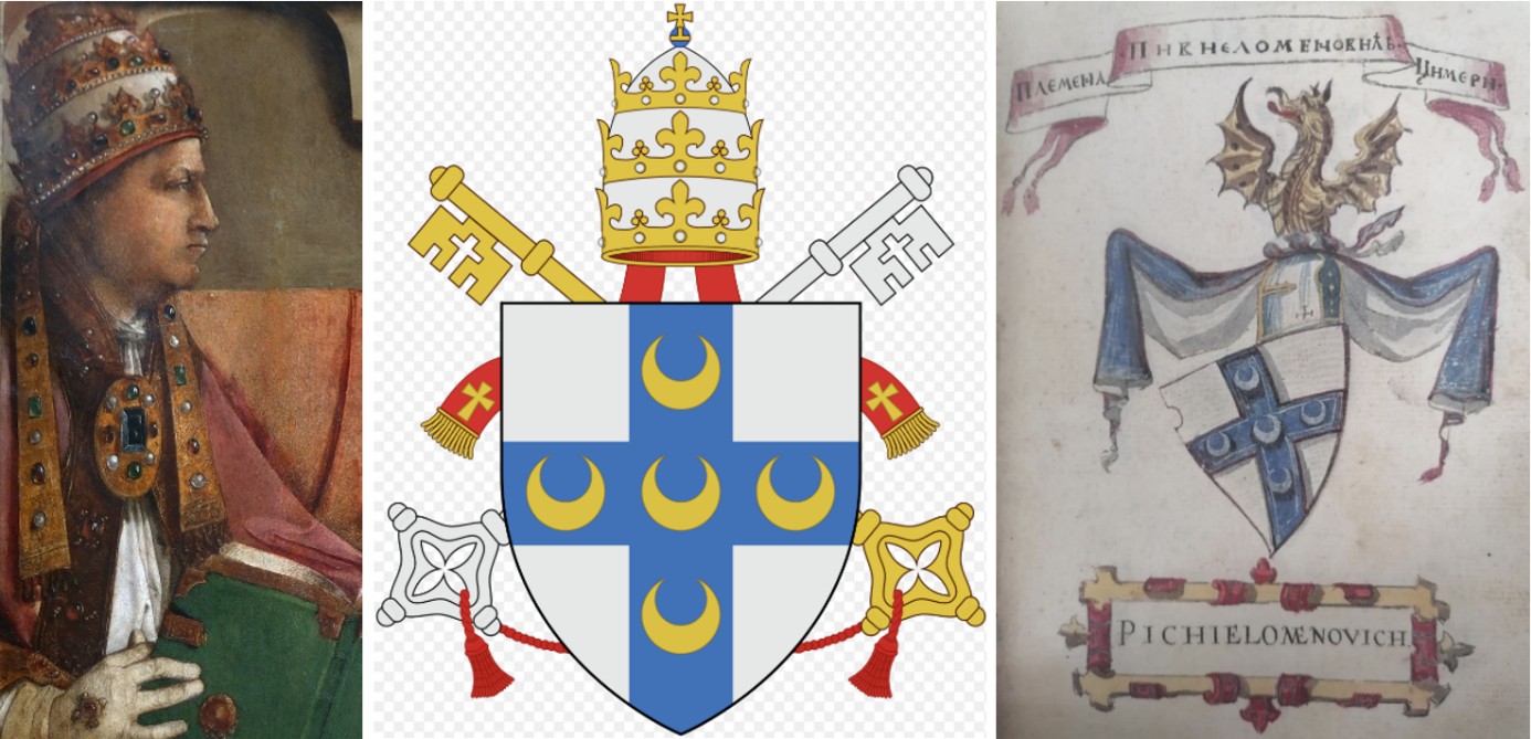 Detalj portreta pape Pia II. (nastalog oko 1472.-1476.) rođenog kao Enea Silvio Bartolomeo Piccolomini 1405. godine u okolici Siene; Papinski grb s heraldičkim znakovima papinske časti (tijarom i ključevima sv. Petra); Jedan od grbova iz prvog hrvatskog grbovnika Korjenić-Neorića sastavljenog 1592. godine koji sadrži istovjetni grbovni štit pripisan tobožnjem rodu Pikjelomenović (u spomen na papu Pia II. Piccolominija koji je nastojao oko osobođenja Bosne)