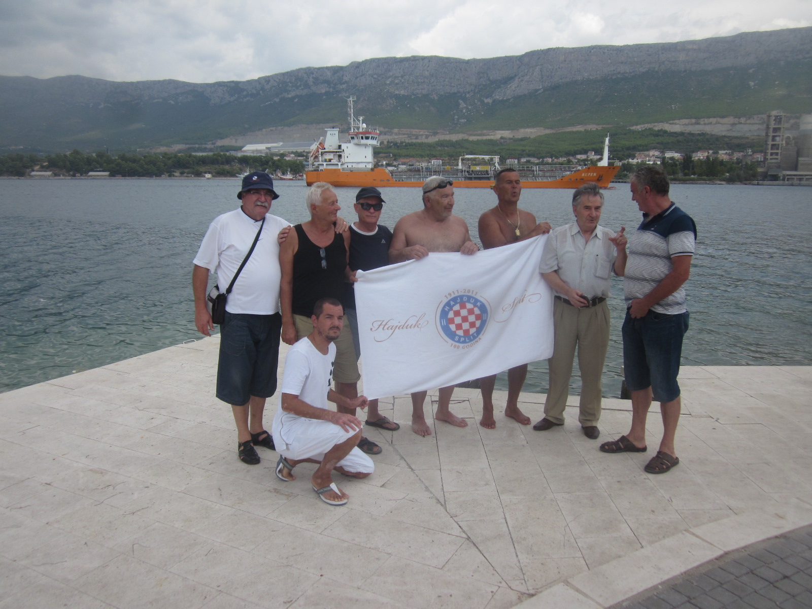 Njegovi pratitelji u barci bili su Joško Jakus i Bogdan Britvić. Osim prijatelja i novinara, Duvnjaka je na Barkovu mulu dočekao pročelnik grada Solina Darko Bilandžić. Ivo je nakon izlaska iz mora bio vidno optimističan kao i svake godine nakon isplivanog maratona. Za okrijepu „Šalšu i makarone“ je pripremio Jerko Podrug pok. Petra, naravno uz domaća vina.
