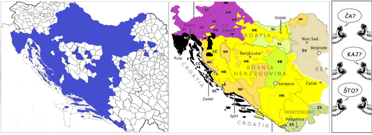 Smještaj hrvatskog naroda uz istočnojadransku obalu i njenu unutrašnjost sredinom 20. st. – administrativna područja nekadašnje FNR Jugoslavije u kojima je prema popisu iz 1961. godine zabilježen zamjetan udio stanovnika hrvatske nacionalnosti (više od 10 %); Približni prikaz rasprostiranja raznih čakavskih (crno), kajkavskih (ljubičasto) i štokavskih (označeno ostalim bojama) dijalekata kojima govore i govornici hrvatskoga jezika s tih područja