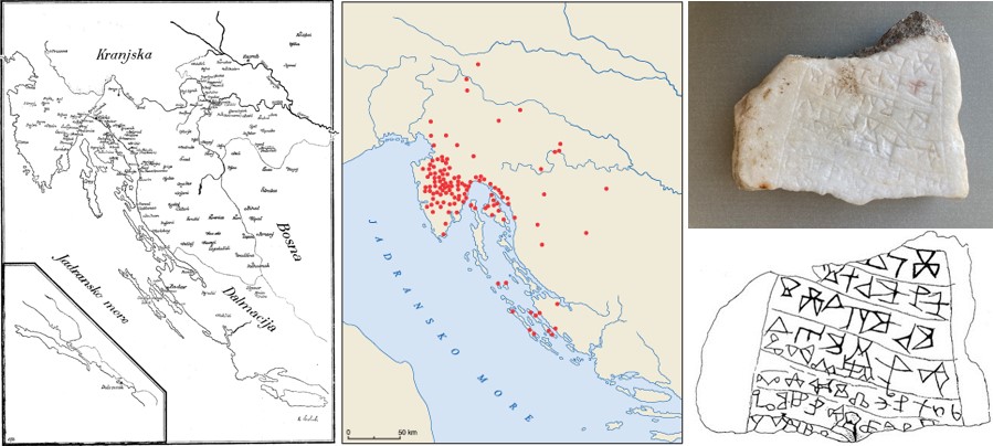Lokacije pronađenih glagoljskih literarnih spomenika u hrvatskim krajevima (prema Rudolfu Strohalu i Branku Fučiću): sjeveroistočnu granicu predstavljaju rijeke Kupa i Sava, a južnu granicu šire područje rijeke Krke – jedinu iznimku predstavljaju Župski odlomak i Konavoski natpis s dubrovačkog područja; Fotografija i precrt Konavoskog natpisa, koji je nastao krajem XI. ili početkom XII. stoljeća, a na kojemu se čita: „Ja klesah to naslijepo…“