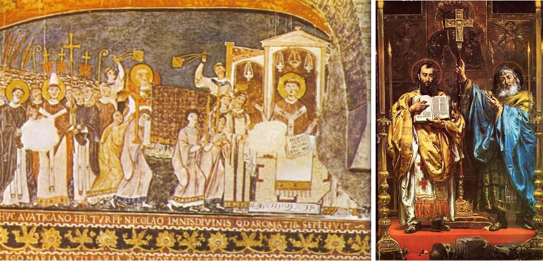 Konstantin i Metod s papom Hadrijanom (freska iz XI. st., Rim); Sveta braća brane liturgiju na slavenskom jeziku pred papom, suvremeni umjetnički prikaz – „I tada biše papa Stipan i posla listove ka svetu mužu Kostancu zovući ga k sebi, jere slišao biše, kako pripovidaše viru Isusovu i da biše tolik puk obratio na viru Isusovu, i zato ga viditi želiše.“ (tekst „Hrvatske kronike„ o Konstantinovu susretu s papom koji se pogrešno naziva „Stipan“ tj. Stjepan)