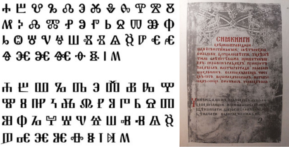 Dva tipa glagoljice – pisma osmišljenog za prevođenje crkvenih tekstova na (staro)slavenski jezik: obla (izvorna) i uglata (koja se tijekom stoljeća razvila u hrvatskim krajevima); Najstariji sačuvani primjerak slavenskog pravnog spomenika „Zakon sudnyj ljudem“ – „I tako sveti muž Konstanc naredi popove i knjigu harvacku i istumači iz grčkoga knjigu harvacku: istumači evanjelja i sve pistule crikvene, i tako staroga kako novoga zakona…“ (tekst „Hrvatske kronike„ o Konstantinovu prevođenju grčkih liturgijskih tekstova na slavenski jezik)
