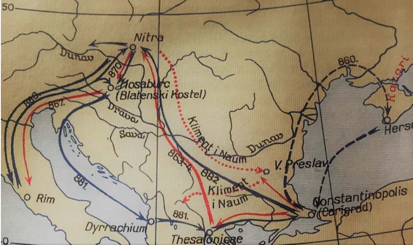 Pretpostavljena putovanja Solunske braće tijekom druge polovice IX. stoljeća (puna crvena crta – zajednička putovanja, puna plava – Metodova, a isprekidana plava crta – Konstantinova putovanja)