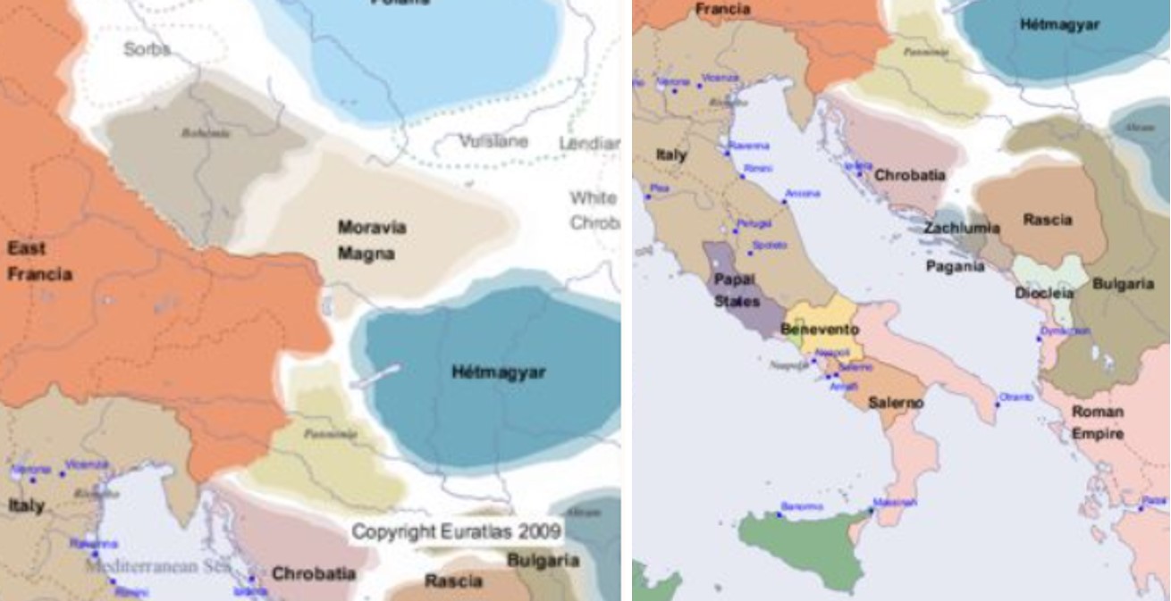 Srednjoeuropsko-jadranski krajevi oko 900. godine, tj. u vrijeme velikomoravskog vladara Mojmira II. i hrvatskog kneza Muncimira, oca kneza/kralja Tomislava. Velikomoravska država je svoju najveću ekspanziju doživjela u vrijeme Rastislavova nasljednika, kralja Svatopluka I. (885. – 894.), inače suvremenika hrvatskog kneza Branimira: zanimljivo je kako Ljetopis popa Dukljanina kao suvremenika Ćirila i Metoda u hrvatskim krajevima navodi moćnog vladara Svetopeleka, kojeg „Hrvatska kronika“ naziva Budimir