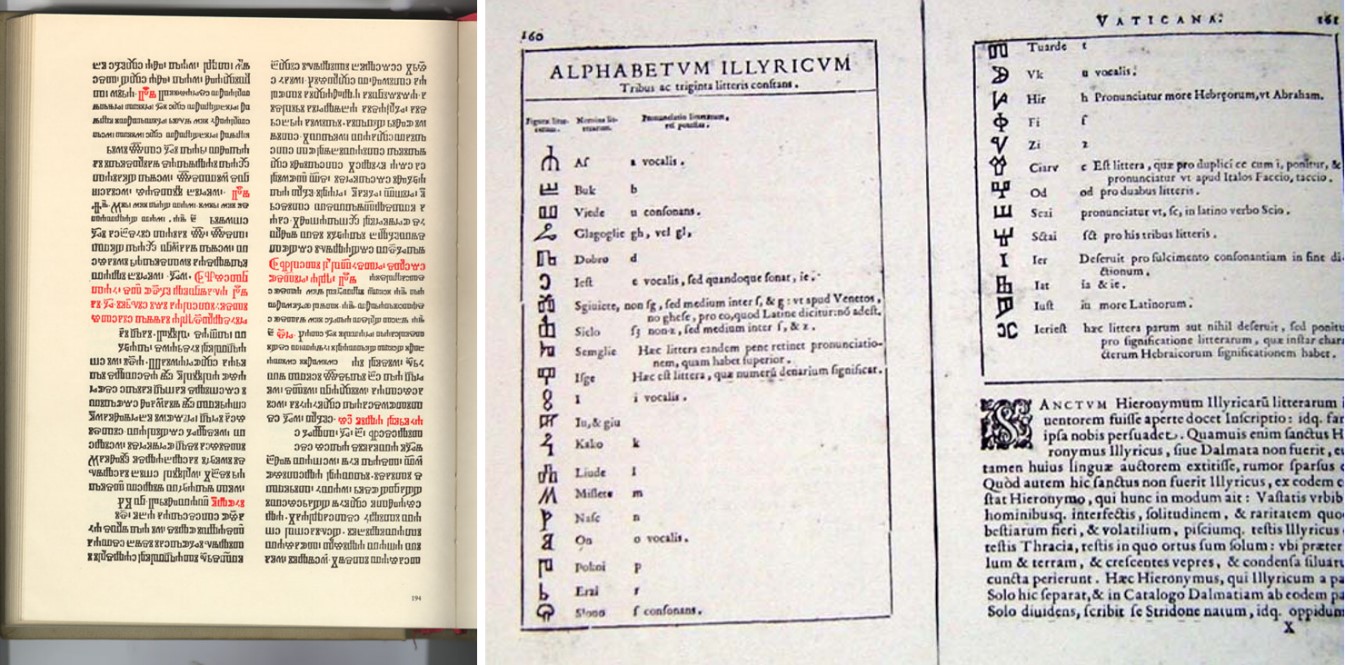 Stranica iz suvremenog pretiska „Misala po zakonu rimskoga dvora“ – prve knjige uopće tiskane na hrvatskom jeziku (ujedno i glagoljicom); Djelo Angela Rocce iz 1591. u kojem je taj autor „izum“ glagoljice, prema uvriježenoj domaćoj tradiciji, pripisao sv. Jeronimu te je nazvao „ilirskim pismom“! Glagoljicu su Jeronimu pripisali i Guillaume Postel (1538.) i Claude Duret (1619.) u Francuskoj; Palatino (1545.) i Orfei (1589.) u Italiji, te (između ostalih) Dubrovčanin Anselmo Banduri u Hrvatskoj 1711. godine
