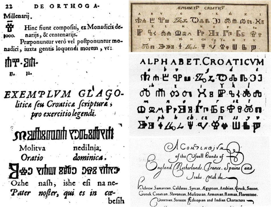 Primjeri iz djela Adama Bohoriča (1584.), braće de Bry (1596.) i Richarda Daniela (1664.) u kojima se uglata glagoljica naziva „hrvatskim alfabetom“ odnosno „hrvatskim slovima“