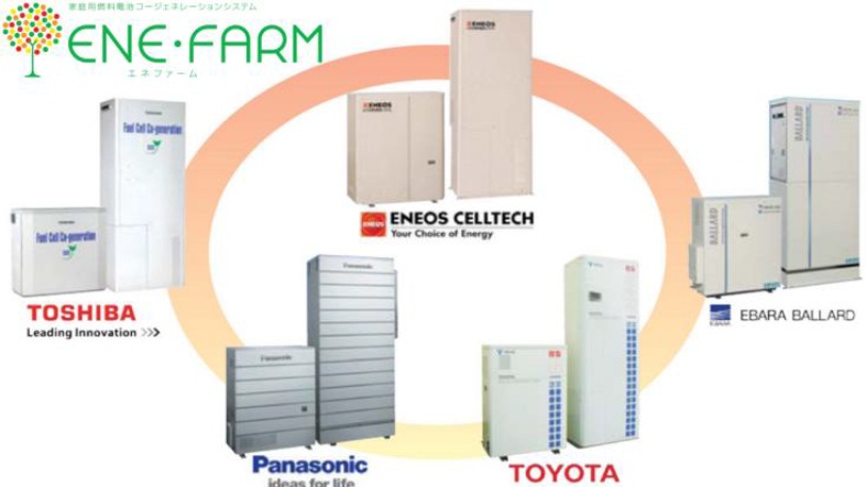 ENE-FARM je zajedničko ime mCHP sustava proizvedenih u Japanu. Od pet početnih proizvođača navedenih na Sl. 3., Ebara je raskinula partnerstvo s Ballardom zbog posljedica recesije u 2008/09., a Toyota se vratila automobilskoj industriji. Pretprošle godine japanski proizvođači su uveli prve automatizirane proizvodne linije mCHP uređaja, što se smatra dugo očekivanim prijelazom na masovnu proizvodnju. S više od 3000 mCHP uređaja instaliranih u japanskim domaćinstvima i očekivanim udvostručenjem godišnje prodaje, komercijalizacija gorivnih članaka je započela. Japanski mCHP uređaji se temelje na PEM gorivnim člancima el. snage od 0,7 do 1.0 kW i toplinskog kapaciteta od 0.9 do1.4 kW s integriranim procesorom goriva prirodnog plina, ukapljenog naftnog plina ili kerozina, te spremnika tople vode (s integriranim bojlerom).