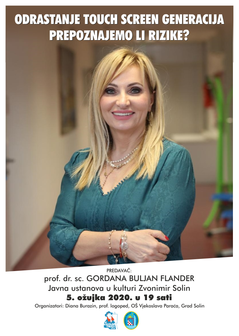 Prof. dr. sc. Gordana Buljan Flander 5. ožujka (četvrtak) s početkom u 19 h održat će predavanje pod naslovom “Odrastanje touch screen generacija – prepoznajemo li rizike?” u Javnoj ustanovi u kulturi Zvonimir Solin. Predavanje je namijenjeno učiteljima, stručnim suradnicima, roditeljima i svima onima koji se bave djecom i mladima.