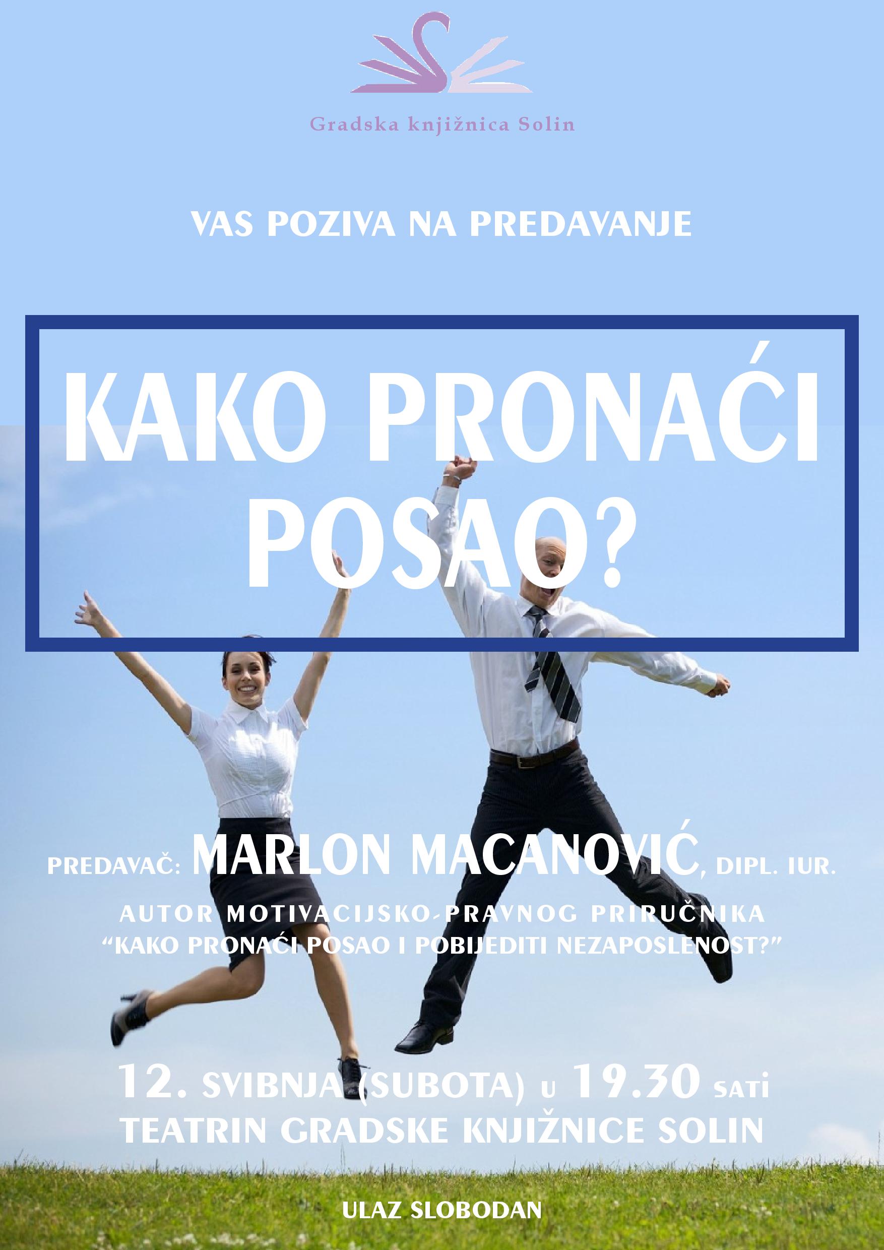 Gradska knjižnica Solin poziva na predavanje “Kako pronaći posao?” Marlona Macanovića, dipl.iur., autora motivacijsko – pravnog priručnika “Kako pronaći posao i pobijediti nezaposelnost?”.