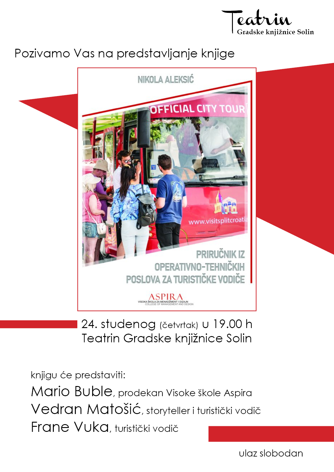 Gradska knjižnica Solin poziva na predstavljanje Priručnika iz operativno-tehničkih poslova za turističke vodiče Nikole Aleksića. Predstavljanje će se održati u četvrtak, 24. studenog u 19 sati u Teatrinu GK Solin. Knjigu će uz autora predstaviti Mario Buble, prodekan Visoke škole Aspira te dugogodišnji turistički vodiči Vedran Matošić i Frane Vuka.