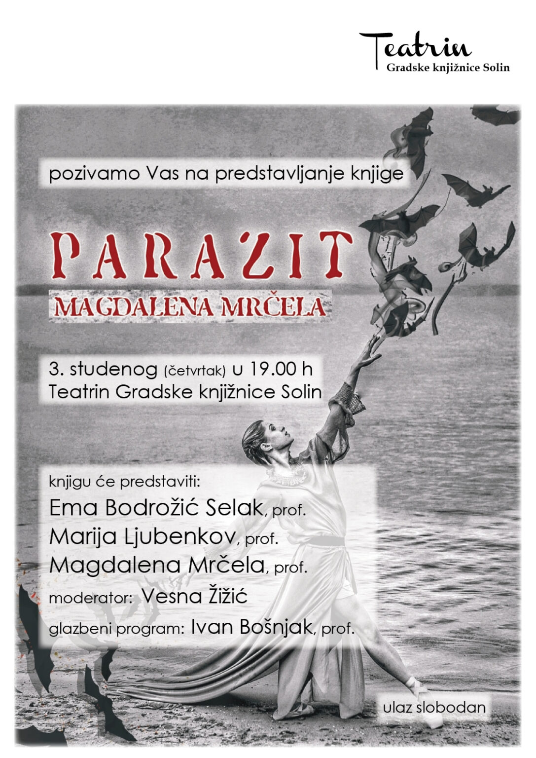 Predstavljanje knjige “Parazit” Magdalene Mrčele, održat će se u četvrtak, 3. studenog u Teatrinu GK Solin s početkom u 19 sati. Knjigu će uz autoricu predstaviti Ema Bodrožić Selak, prof. i Marija Ljubenkov, prof. Večer će moderirati Vesna Žižić, a za glazbeni ugođaj pobrinut će se Ivan Bošnjak, prof.