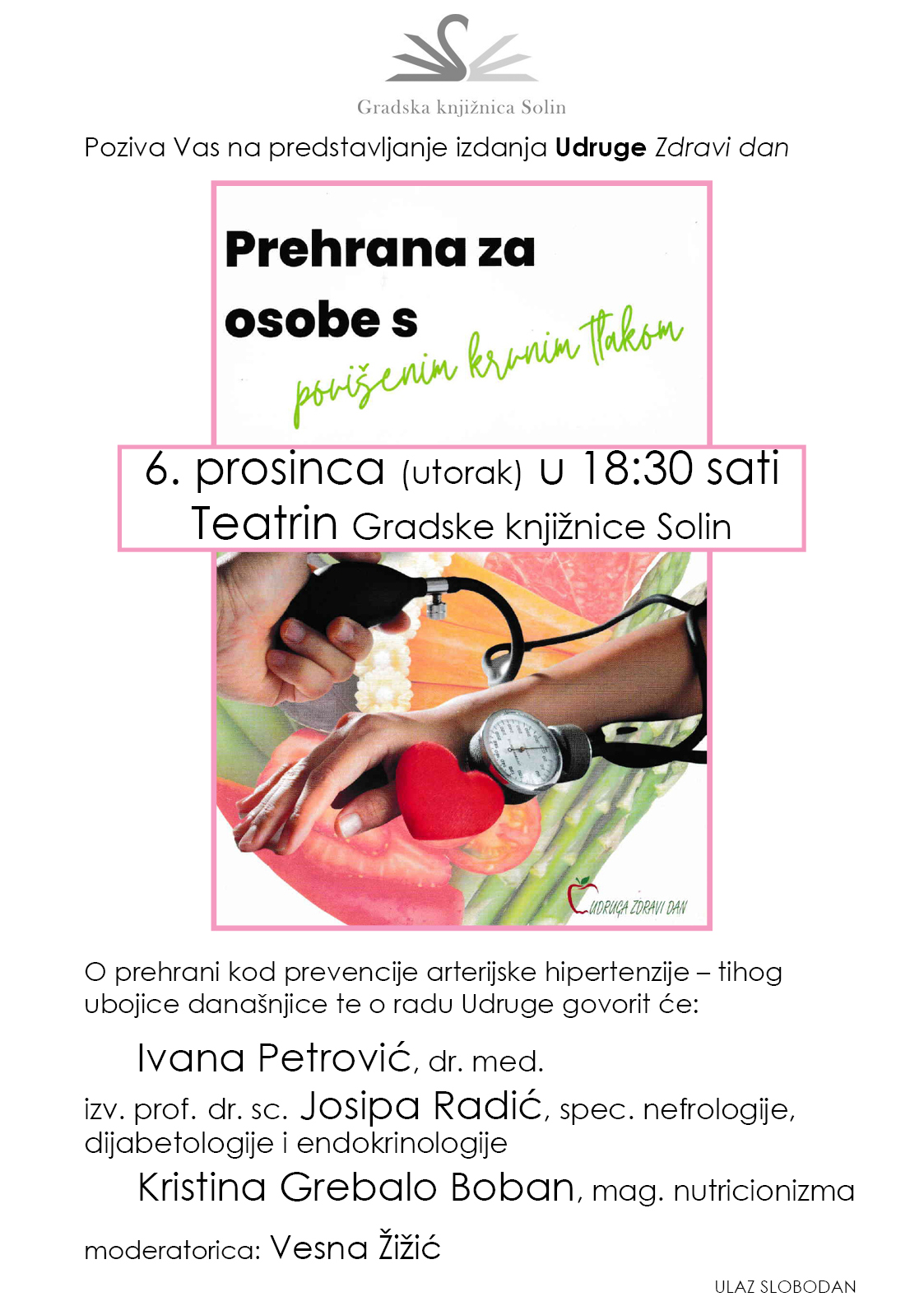 Gradska knjižnica Solin i Udruga Zdravi dan pozivaju na predstavljanje knjižice Prehrana za osobe s povišenim krvnim tlakom. Predstavljanje ovog izdanja Udruge Zdravi dan koje je nastalo u partnerstvu s Hrvatskom ligom za hipertenziju održat će se u Teatrinu GK Solin u utorak, 6. prosinca 2022.g. u 18:30h.