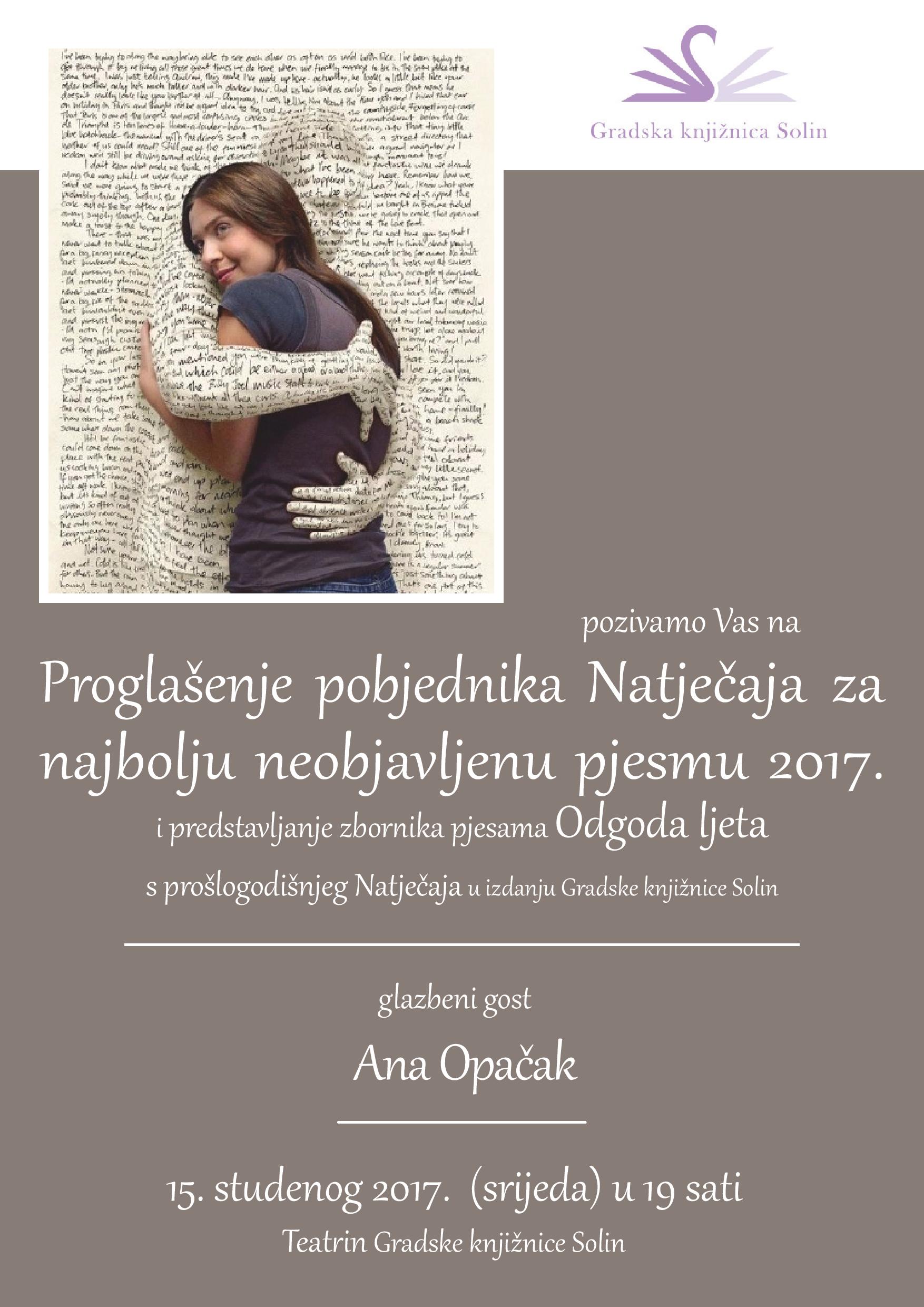 Proglašenje pobjednika 7. po redu Natječaja biti će upriličeno u srijedu, 15. studenog u Teatrinu GK Solin s početkom u 19 sati. Tom će prigodom biti predstavljen i Zbornik “Odgoda ljeta” s prošlogodišnjeg Natječaja u izdanju Gradske knjižnice Solin, a glazbeni gost biti će Ana Opačak.
