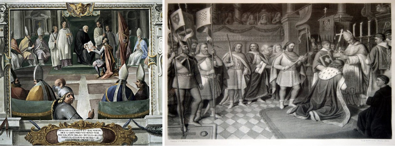 Najstariji prikaz krunidbe kralja Zvonimira uopće: zidna slika koju je između listopada 1610. i prosinca 1614. godine izradio Marzio Ganassini (Città del Vaticano, Palazzo Apostolico, Archivio Segreto Vaticano, Piano Nobile, druga soba) na kojoj je vidljiva zastava sa simbolom bazilike; „Krunjenje kralja Zvonimira“ – litografija nastala tijekom druge polovice XIX. (autor Franjo Josip Mücke), na kojoj se u gornjem lijevom kutu ističu zastave Dalmacije (polje s tri leopardove glave) i Hrvatske (crveno-srebrno šahirani štit) u rukama dvorskih stjegonoša