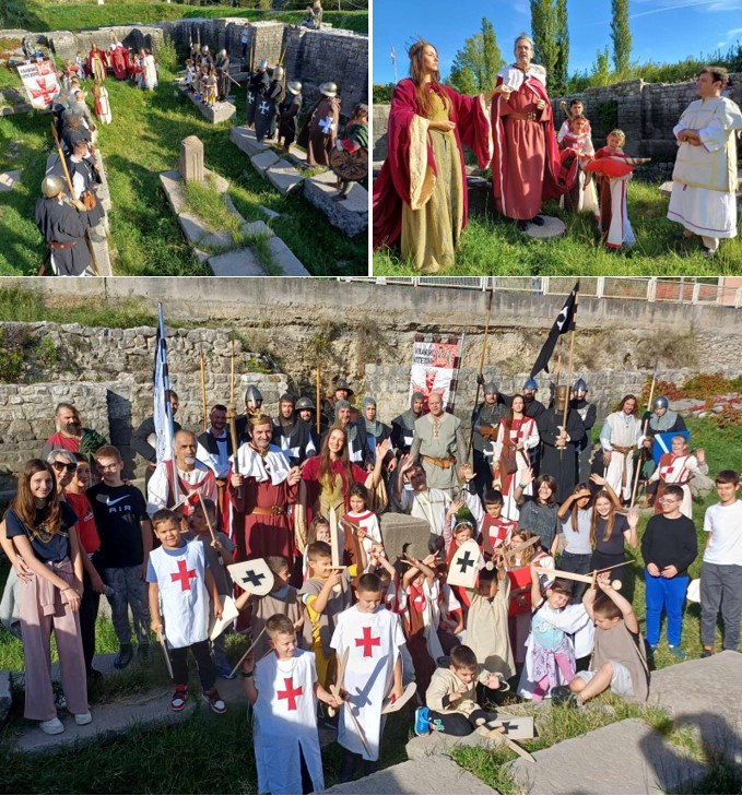 Sudionici manifestacije „Krunom hrvatskih vladara“ Solin-Klis 2024. s djelatnicama OŠ „Petra Kružića“ prilikom predstavljanja dječjih radova i strateške igre „Uskočko srce – prkos od davnina“ nastalih u okviru istoimenog projekta kliške osnovne škole, a u realizaciji kojega su sudjelovali i pripadnici povijesne postrojbe „Kliški uskoci“