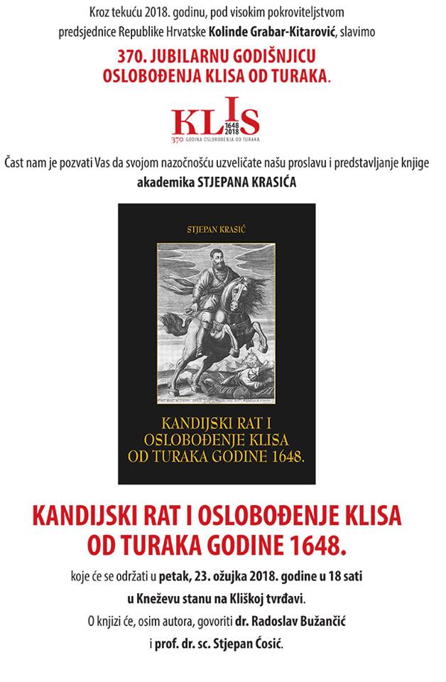Ovog petka, 23.03.2018. u 18. sati na Kliškoj tvrđavi će biti promocija knjige Stjepana Krasića “Kandijski rat i oslobođenje Klisa od Turaka 1648.”