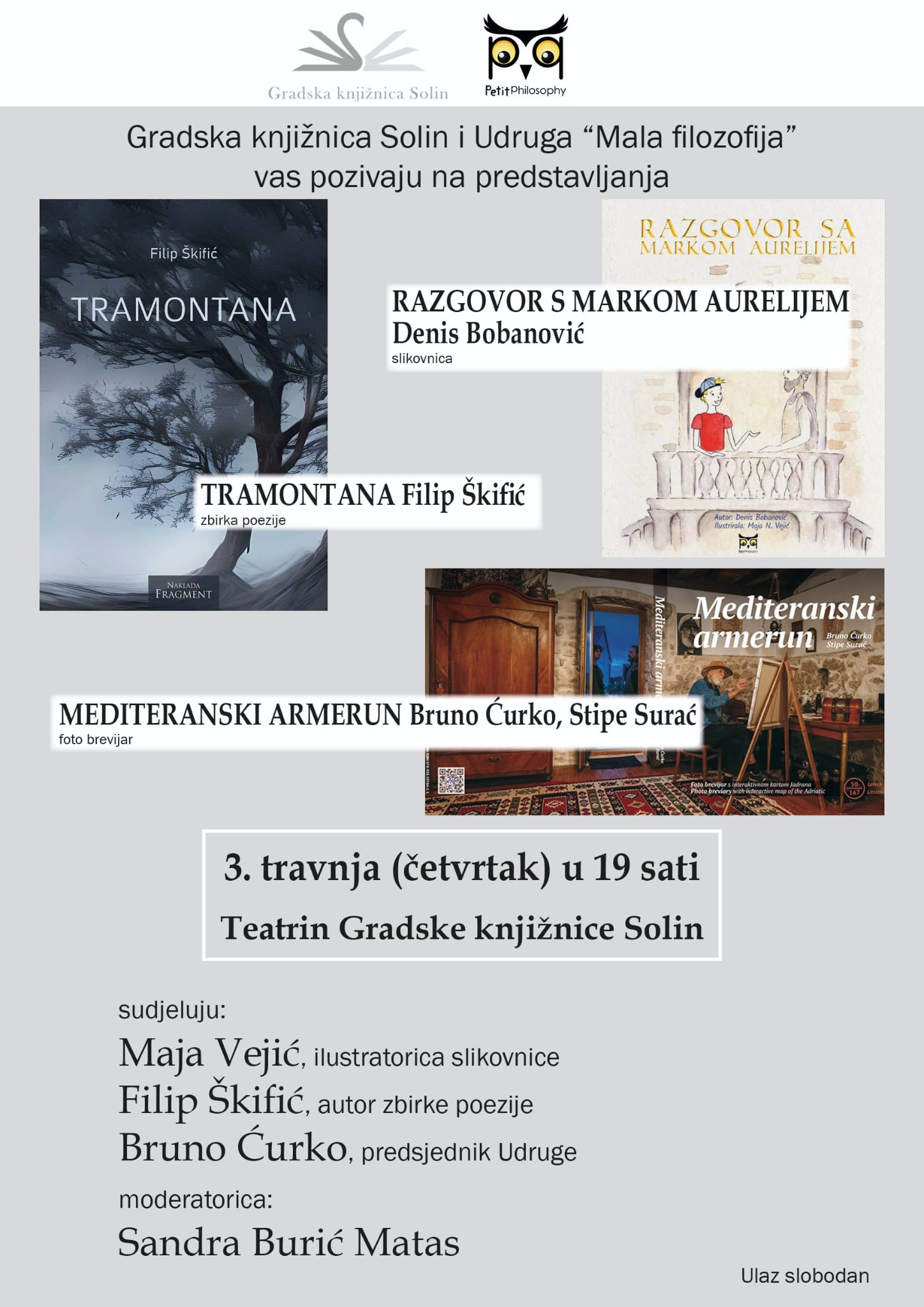 Gradska knjižnica Solin i Udruga “Mala filozofija” pozivaju na promociju triju publikacija koja će se održati u Teatrinu GK Solin u četvrtak, 3. travnja s početkom u 19 sati.
