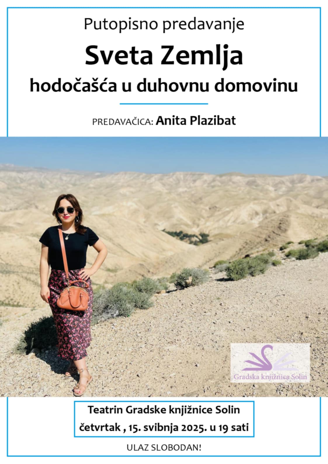 Gradska knjižnica Solin poziva na putopisno predavanje Anite Plazibat ”Sveta Zemlja: hodočašća u duhovnu domovinu” koje će se održati u četvrtak, 15. svibnja u Teatrinu GK Solin s početkom u 19 sati.