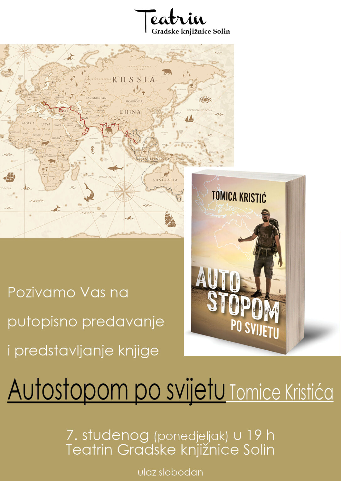 Putopisno predavanje i predstavljanje knjige “Autostopom po svijetu” Tomice Kristića održat će se u Teatrinu GK Solin u ponedjeljak, 7. studenog u 19 sati.