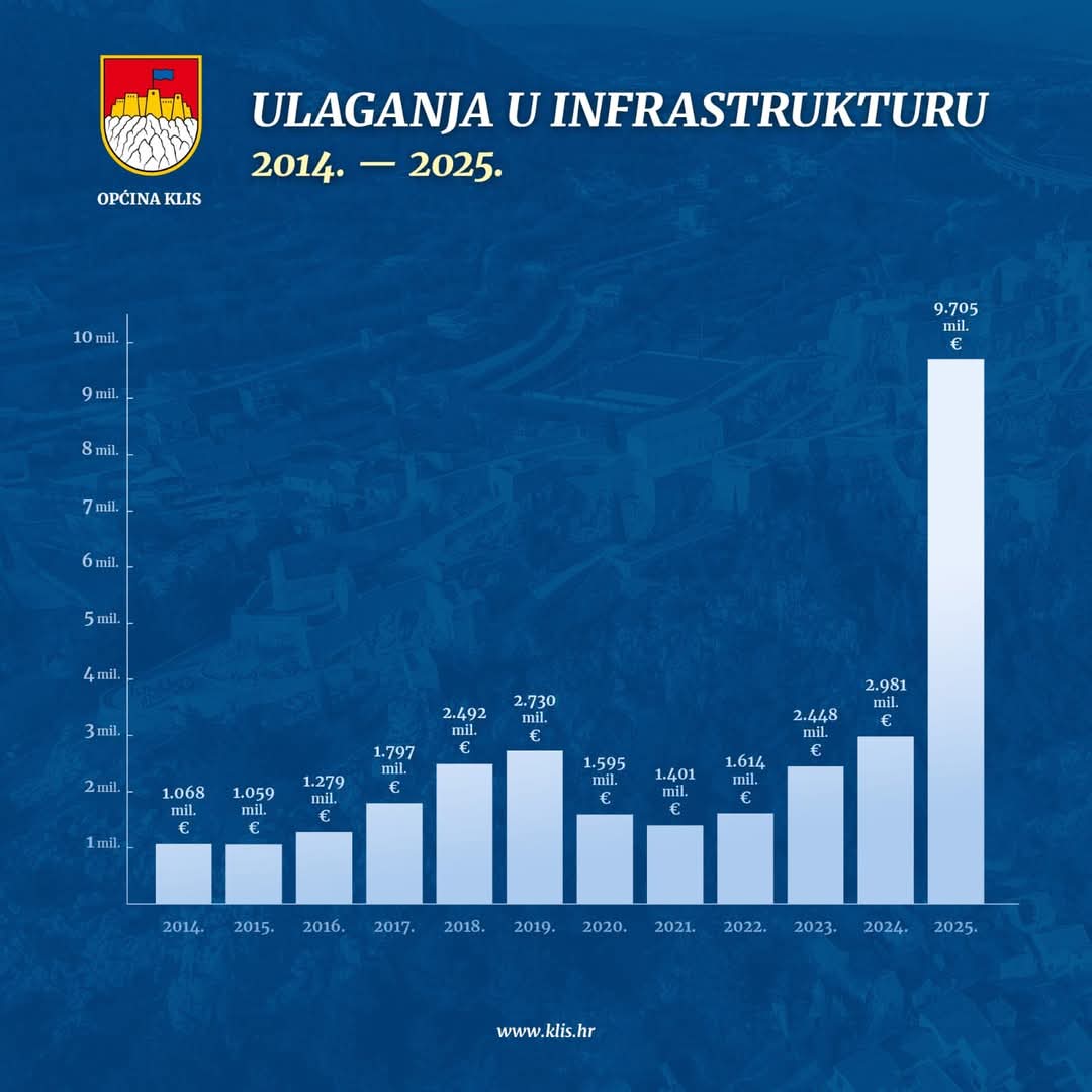 Od 2014. do 2024. Općina Klis bilježi rast ulaganja u komunalnu infrastrukturu za 180%, sa 1.068 na 2.981 milion eura.