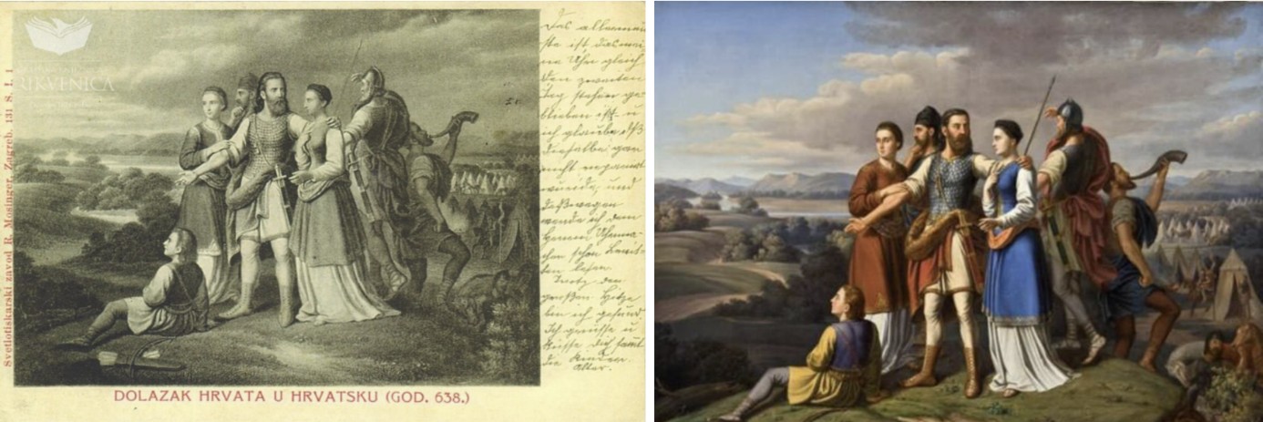 Reprint razglednice koja prikazuje ilustraciju „Dolazak Hrvata u Hrvatsku (god. 638.)“. Autor izvornog djela iz 1867. prema kojem je ilustracija nastala je Josip Franjo Mücke (1819.-1883.) (Gradska knjižnica Crikvenica); Istovjetno kolorirano djelo povijesnog slikarstva XIX. stoljeća