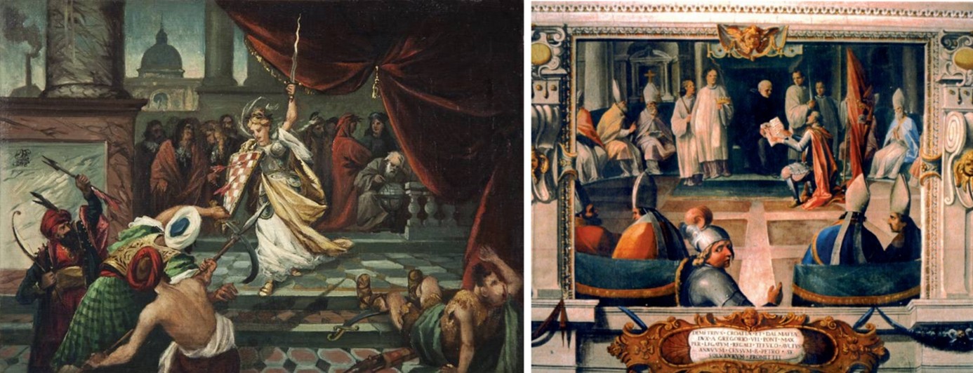 Primjerice, kada je početkom XVII. stoljeća M. Ganassini prikazao krunidbu kralja Zvonimira na fresci koja se i danas nalazi na zidu Vatikanskog tajnog arhiva, u tu je ceremoniju uklopio samo purpurnu zastavu s papinskim znamenjem, dakle bez ikakvih „kockica“ iz grba Hrvatske. No, u vrijeme nacionalnog „buđenja“ tijekom druge polovice XIX. stoljeća, motivi kralja Zvonimira i njegove krunidbe su bili osobito popularni pa je Zvonimirovu krunidbu tada umjetnički prikazao hrvatski slikar Josip Franjo Mücke (1819.-1883.), a 1878. godine i njegov učenik Ferdinand Quiquerez (1845.-1893.). Likovni prikazi obojice slikara, nastali u duhu nacionalnog romantizma, u svoju su likovnu simboliku naravno uključili i zemaljske grbove Hrvatske i Dalmacije na zastavama, kojima nema traga na vatikanskoj fresci s početka XVII. stoljeća!