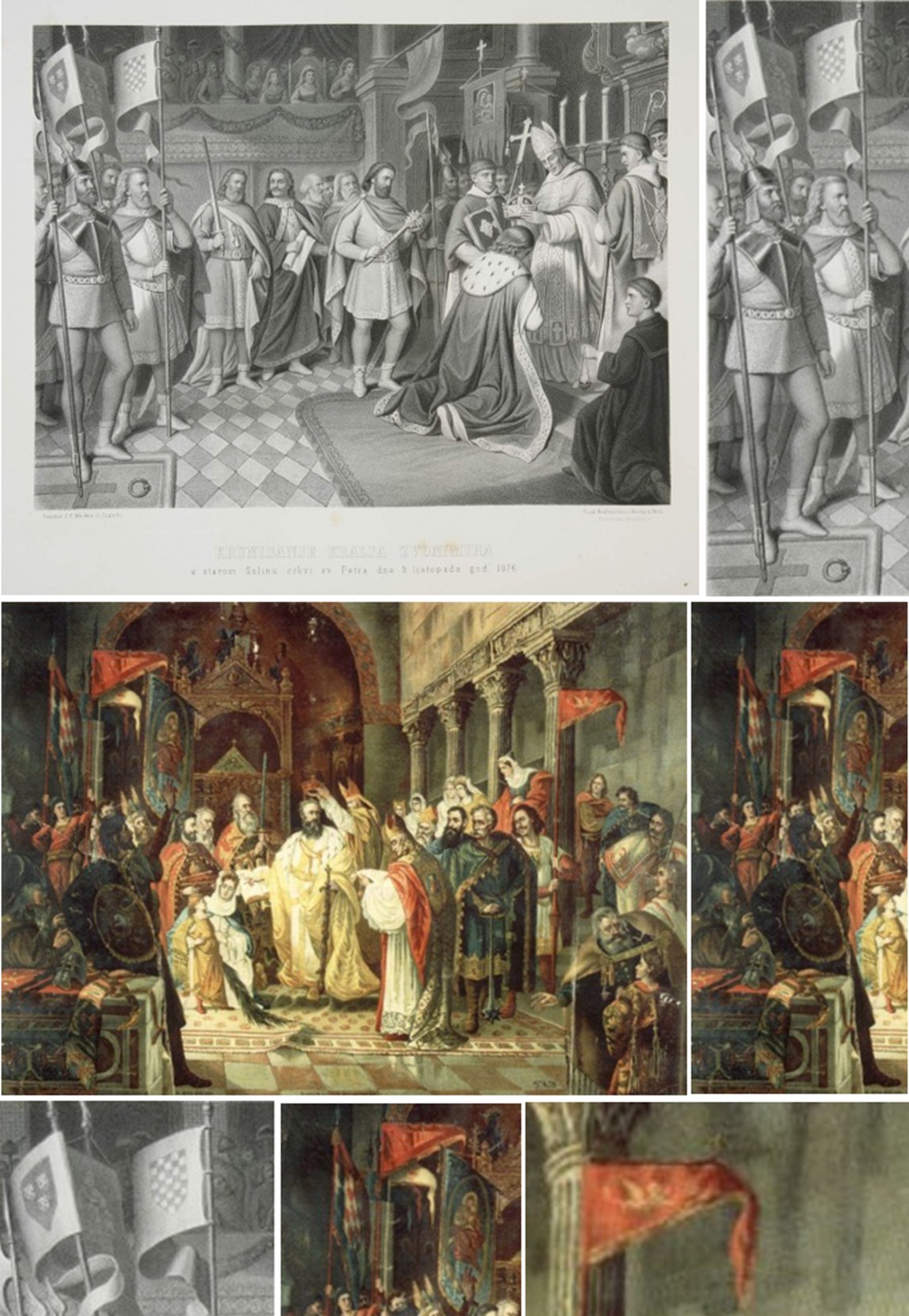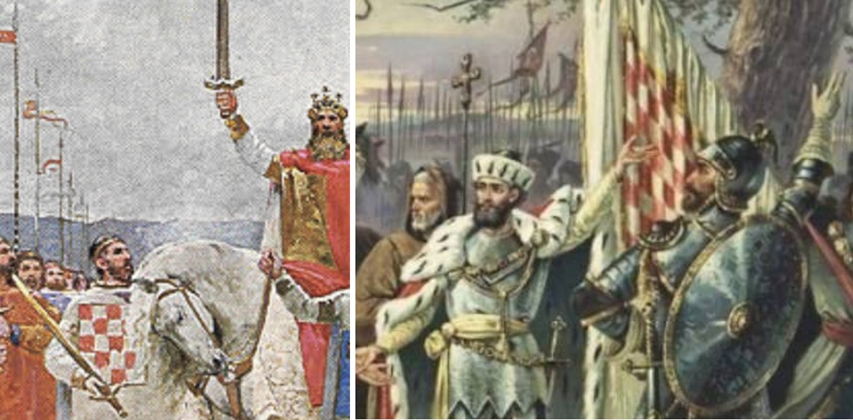 Početno polje šahiranog grba Kraljevine Hrvatske crvene boje – „Krunidba kralja Tomislava” O. Ivekovića (1905.) i početno polje šahiranog grba Kraljevine Hrvatske srebrne (ili „bijele“) boje – „Tomislav, prvi hrvatski kralj” F. Quiquereza (1888.)