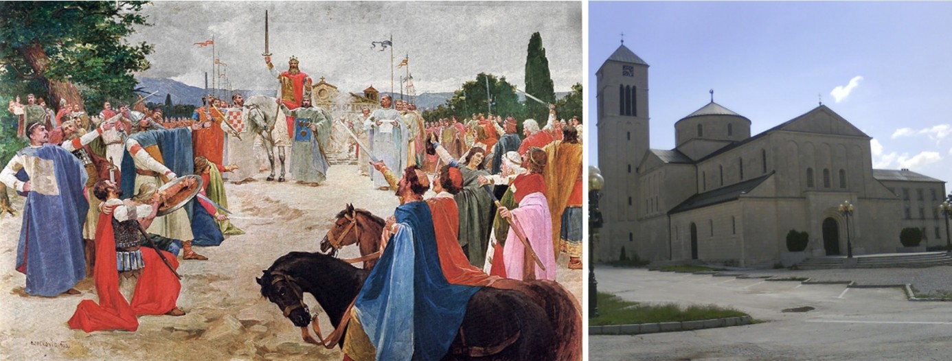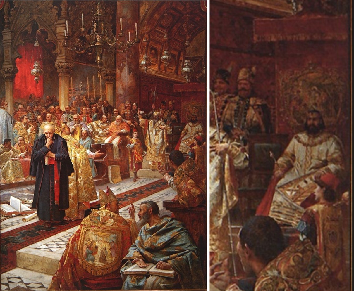 Kralj Tomislav predsjeda saborom na djelu povijesnog slikarstva s kraja XIX. stoljeća: „Splitski crkveni sabor 925. godine” autora Mate Celestina Medovića (1857.-1920.)