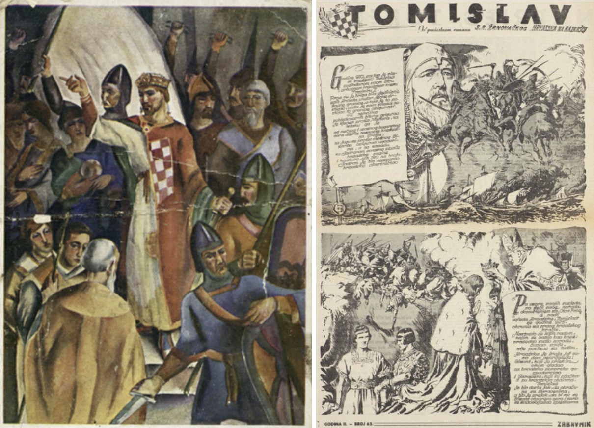 Kralj Tomislav u imaginaciji na razglednici i u stripu – autor prvog prikaza je vjerojatno Marijan Trepše, a drugog Andrija Maurović. U prvom primjeru šahirani grb Hrvatske zauzima središnje mjesto na kraljevskoj odori, dok je u drugom sporedni element ukrasa naslovnice
