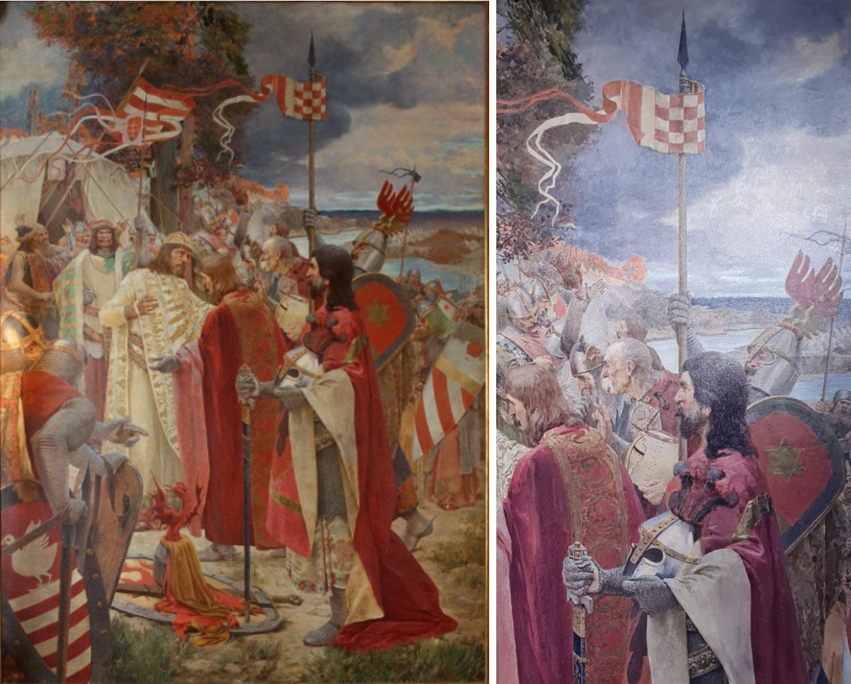 Zastava sa šahiranim poljima iz grba Hrvatske uočava se i na detalju djela „Poljubac mira hrvatskih velmoža kralju Kolomanu 1102. godine“ Otona Ivekovića iz 1906. godine