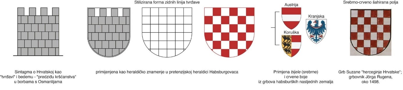 Slijed oblikovanja hrvatskog grba sa šahiranim poljima u habsburškoj pretenzijskoj heraldici od Krbavske bitke do prvih grbovničkih prikaza (Ilustraciju izradio: Kristijan Kuliš) – Grb Hrvatske sa šahiranim poljima nastaje tek krajem XV. stoljeća te su prema tome svi navedeni umjetnički prikazi XIX. i prve polovice XX. stoljeća koji taj znamen vežu uz ranosrednjovjekovni period vladarske kuće Trpimirovića anakroni i povijesno neutemeljeni!