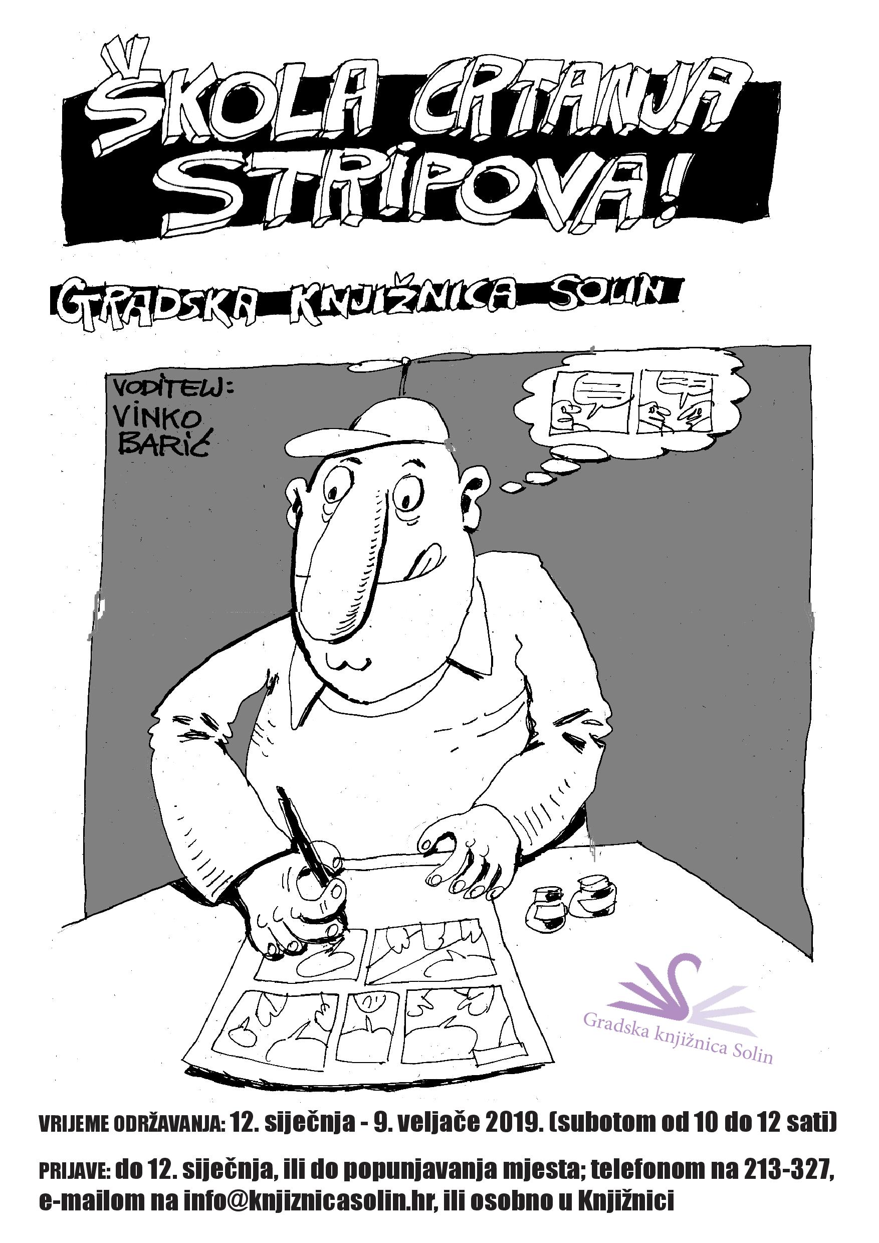 U Gradskoj knjižnici Solin počinje Škola crtanja stripova. Vrijeme održavanja je 12. siječnja – 9. veljače 2019. (subotom od 10 do 12 sati). Voditelj radionice je Vinko Barić, akademski slikar.