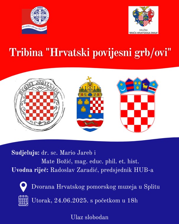 Suradnja koja slijedi jest sa splitskom Hrvatskom udrugom Benedikt te s Družbom „Braće Hrvatskoga Zmaja“ – Zmajski stol u Splitu,. Naime, povodom nedavne deklaracije HAZU o hrvatskom povijesnom grbu (5. lipnja 2025.), a u organizaciji dviju spomenutih udruga, u utorak 24. lipnja 2025. s početkom u 18 sati u dvorani Hrvatskog pomorskog muzeja u Splitu (na tvrđavi Gripe) bit će održana javna tribina „Hrvatski povijesni grb/ovi“. Uvodnu riječ će održati Radoslav Zaradić, predsjednik Hrvatske udruge Benedikt, dok će na samoj tribini sudjelovati: dr. sc. Mario Jareb – član Družbe „Braće Hrvatskoga Zmaja“ i Mate Božić, mag. educ. phil. et hist. – herold Povijesne postrojbe „Kliški uskoci“ te ujedno voditelj kliške „Škole heraldike“.