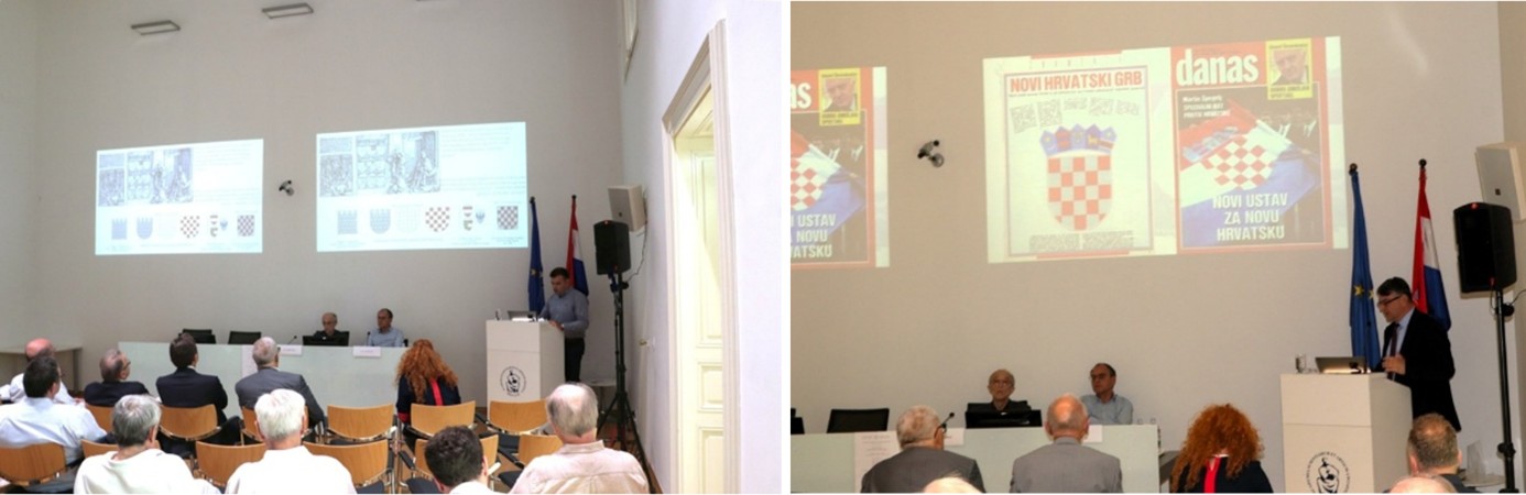 Ipak, iz današnje perspektive aktualnije je izlaganje „Crveno ili bijelo? Bijelo ili crveno? Stereotipi i suvremeni prijepori oko boje početnoga polja hrvatskoga šahiranog grba” (Mario Jareb). Naime, u posljednja tri desetljeća hrvatski javni prostor ispunjen je stereotipom o hrvatskom šahiranom grbu s početnim bijelim poljem kao simbolom koji nije prihvatljiv. Najčešće se takav grb etiketira kao ustaški, odnosno kao simbol Nezavisne Države Hrvatske.