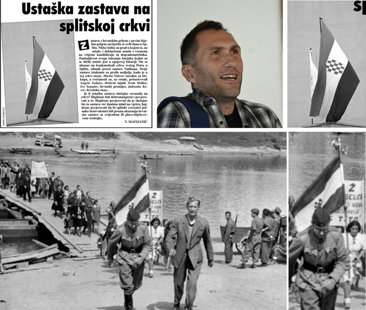 Jedan od prvih opisa isključivo „zastave s hrvatskim grbom s prvim bijelim poljem“ kao „ustaške zastave“ u tekstu nedavno preminulog novinara Vladimira Matijanića (1972.-2022.) –„Feral Tribune“, 26. studenoga, 2004.; Istovjetna zastava koju su početkom svibnja 1945. u okolici Karlovca koristile partizanske jedinice, a V. Matijanić je 2004. neutemeljno naziva „ustaškom“