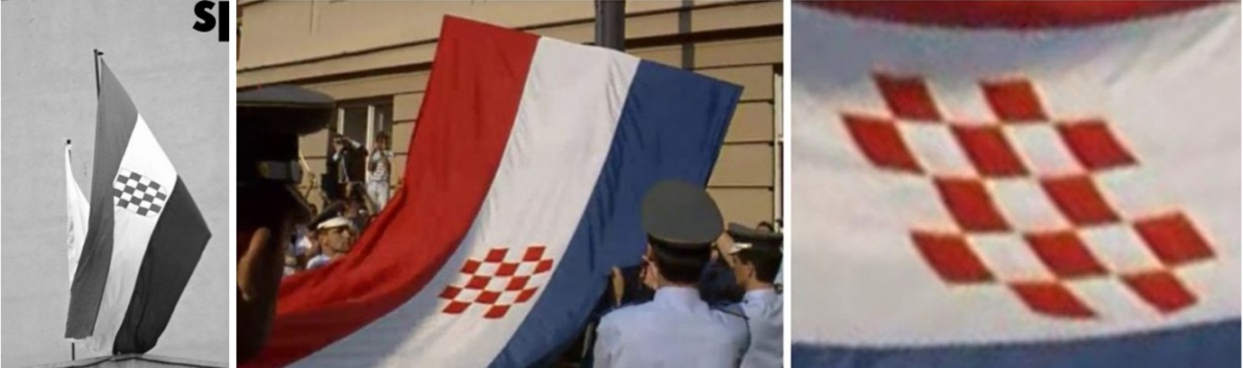 Znakovlje ND Hrvatske (1941.-1945.) u kojoj je vladajući režim tvorio Ustaški pokret bilo je prepoznatljivo obilježeno simbolikom upravo te političke i totalitarne organizacije (lijevo), odnosno dominantnim slovom U (desno), koje se ne uočava na splitskoj zastavi iz 2004., kao ni na zastavi iz okolice Karlovca 1945. godine, a koja još kronološki i državnopravno prethodi (gornja ilustracija)