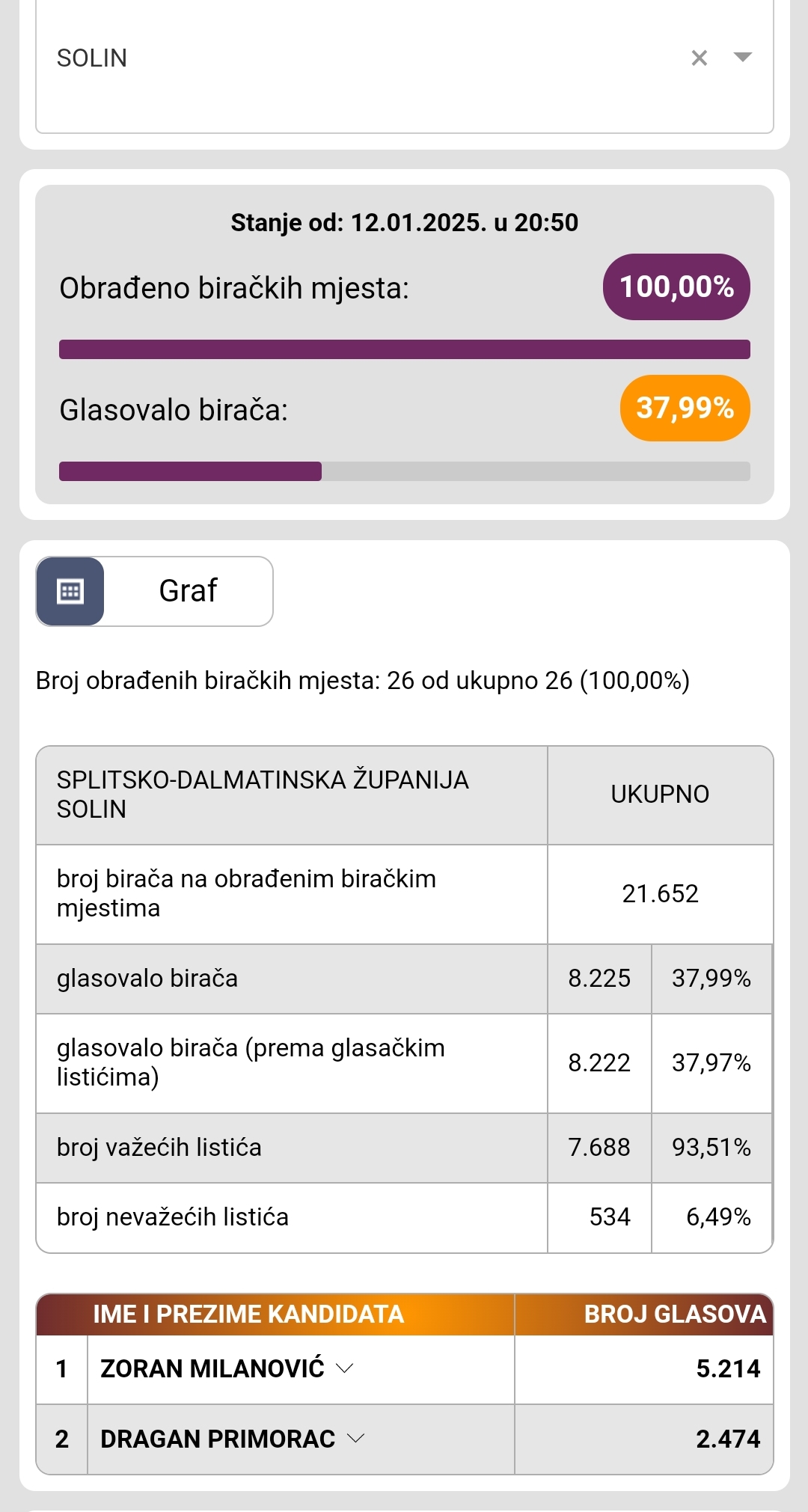 Rezultati predsjedničkih izbora u Solinu prava su politička pljuska za lokalni HDZ, koji se očito više ne može osloniti na “svetost svojih tvrđava”. Kandidat HDZ-a, Dragan Primorac, uspio je osvojiti svega 2474 glasa, što je poražavajući rezultat za stranku koja godinama vlada Solinom kao da je to njihova privatna baština. S druge strane, Zoran Milanović, kandidat SDP-a, osvojio je čak 5214 glasova, što jasno pokazuje da je Solin, nekad bastion desnice, počeo ozbiljno preispitivati svoj politički smjer.